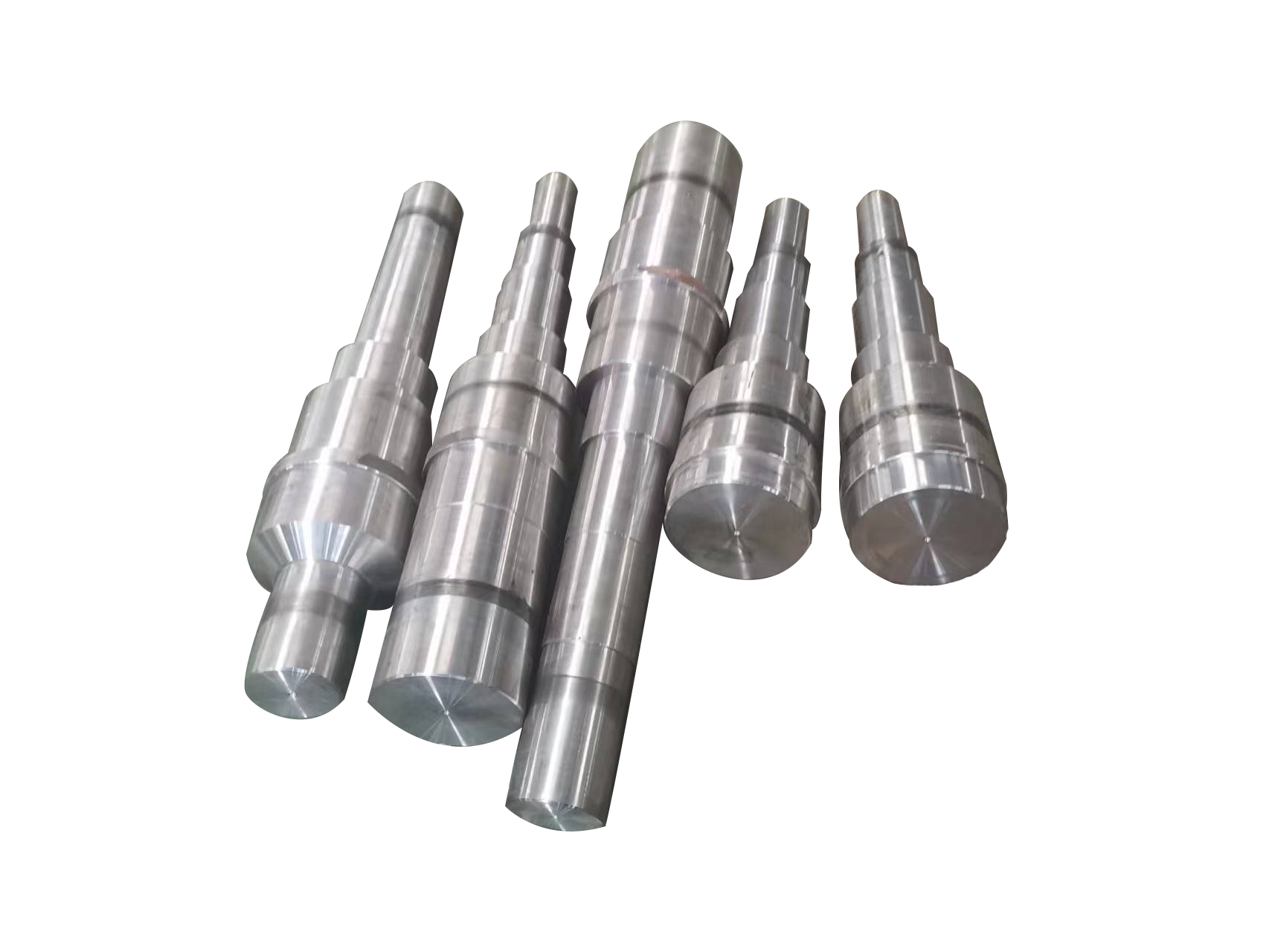 棒料、鍛件 → 粗車加工 → 調質 → 精車加工 → 銑鍵槽 → 熱處理(表面淬火貨滲碳淬火) → 研磨中心孔 → 粗磨 → 精磨 → 成品檢測包裝